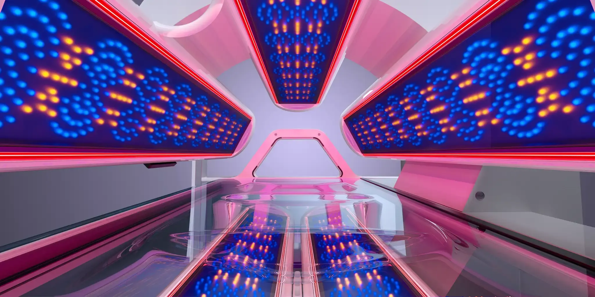 This bed is fully touchscreen-controlled. So, you can set it up the way you like. Adjust the fans, facial tanners, lighting, even the music volume. All done at your fingertips before the session starts.